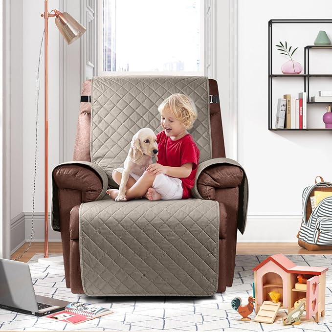 KinCam 100% Waterproof Recliner Chair Cover, Reclining Couch Covers for Pets, Dogs, Recliner Couch Slipcover Furniture Protector with Elastic Straps for Kids(30", Khaki)