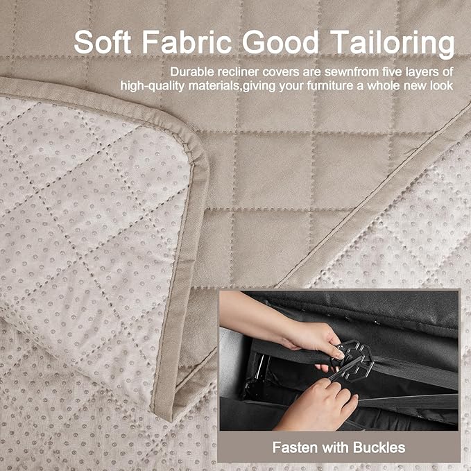- Upgrade Anti -Slip Design: The back of the recliner chair cover is designed with a new upgraded non -slip large particles to reduce the sliding of the reclining chair cover. Easy to fit for your sofa recliner with our user manual. Just drape the furniture with our covers, tuck the excess fabric into the gap between the back and couch cushion. Use the elastic straps secure the slipcover stay in place firmly