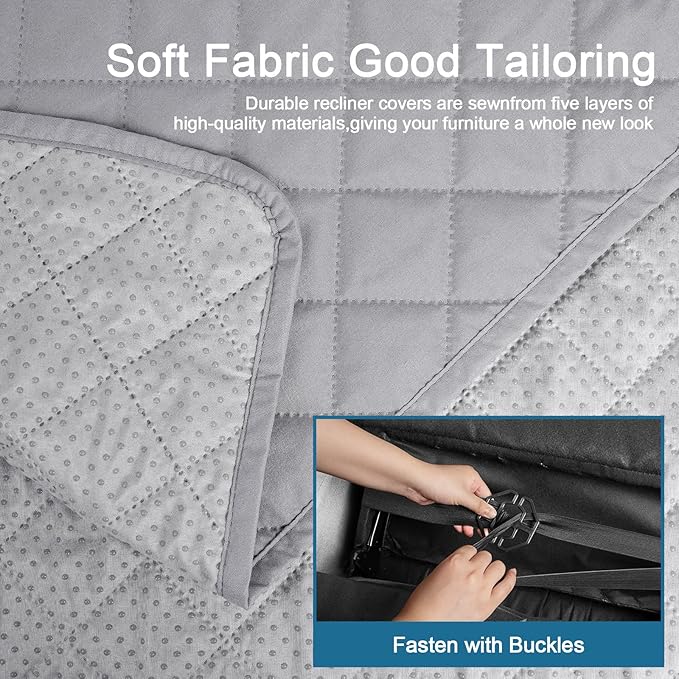 - Upgrade Anti -Slip Design: The back of the recliner chair cover is designed with a new upgraded non -slip large particles to reduce the sliding of the reclining chair cover. Easy to fit for your sofa recliner with our user manual. Just drape the furniture with our covers, tuck the excess fabric into the gap between the back and couch cushion. Use the elastic straps secure the slipcover stay in place firmly