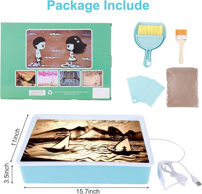 - Packing list:1 sand painting light box with usb cable, 1 bag super fine sand, 1 small broom, 1 small dustpan,1 brush ,1 set scraper(3pcs)