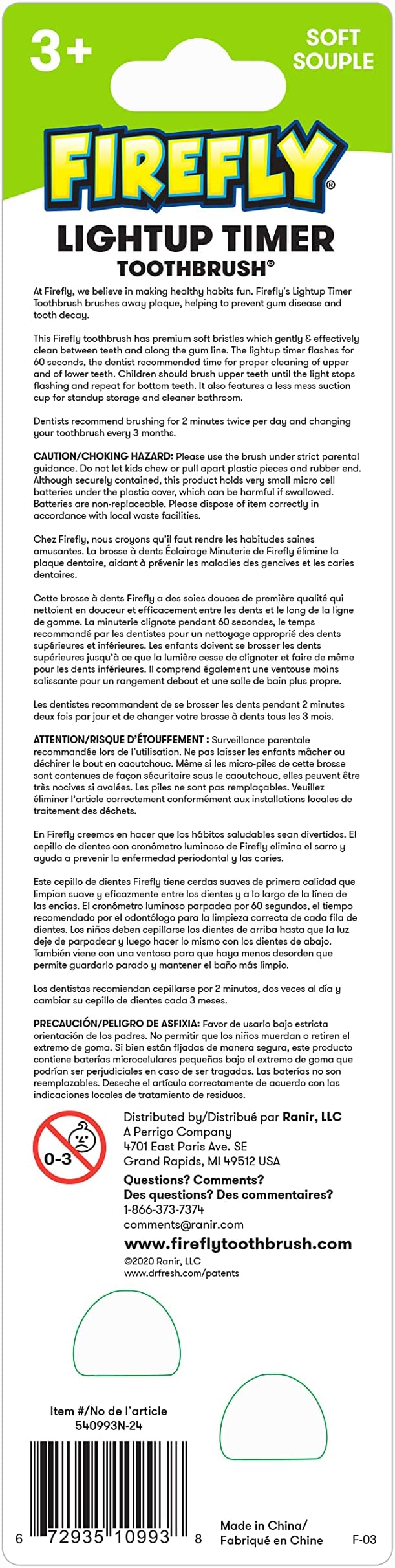 - Includes: pack of 2 Firefly light up toothbrush with built-in timer and battery
