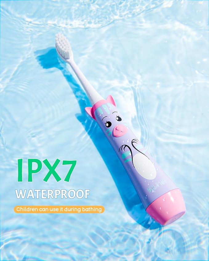 • 🦷 𝗦𝗮𝗳𝗲 & 𝗪𝗮𝘁𝗲𝗿𝗽𝗿𝗼𝗼𝗳 𝗗𝗲𝘀𝗶𝗴𝗻 - IPX7 waterproof rating and made from BPA-free materials, ensuring safety for children. The design includes protective features to prevent the toothbrush from extending too far into the mouth, reducing the risk of injury. Suitable for children aged 3 and up.