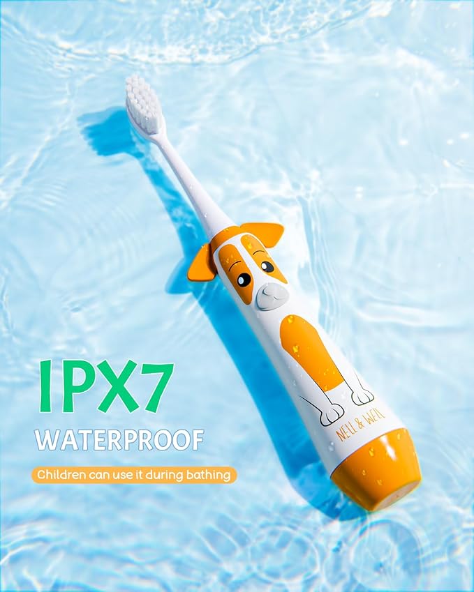 - 🦷 𝗦𝗮𝗳𝗲 & 𝗪𝗮𝘁𝗲𝗿𝗽𝗿𝗼𝗼𝗳 𝗗𝗲𝘀𝗶𝗴𝗻 - IPX7 waterproof rating and made from BPA-free materials, ensuring safety for children. The design includes protective features to prevent the toothbrush from extending too far into the mouth, reducing the risk of injury. Suitable for children aged 3 and up.
