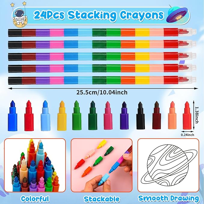 - Super Value Bulk Coloring Books: The package includes 24 packs of outer space coloring books in 8 styles and 24 pieces of stacking pencils in 12 colors. Each book is printed with 12 varying pictures. Double-side printing. 96 no duplicate patterns. The quantity is enough to meet your DIY needs