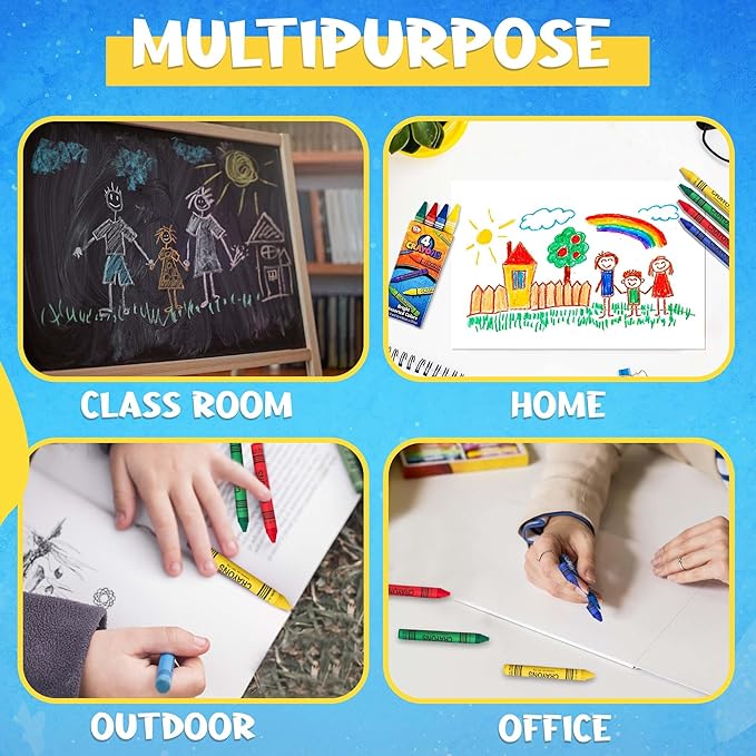 - Assorted Colors: 144 4-packs of crayons in a box wrap with assorted colors like blue, red, yellow, and green