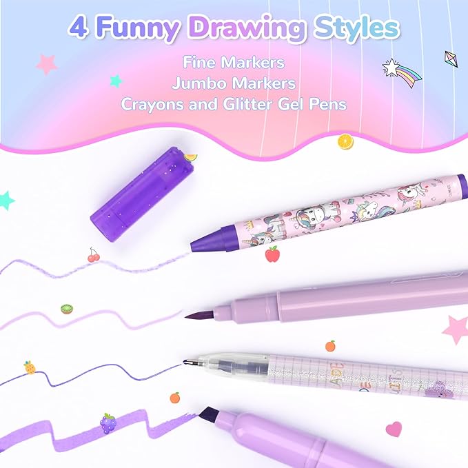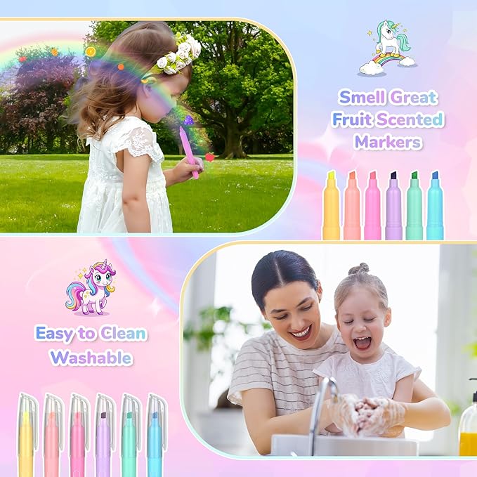 - 【54 PCS Unicorn Markers Set for Kids】Comes with 1 X Unicorn Glittery Pencil Case, 12 X Washable Fruit Scented Glitter Pens, 12 X Washable Fruit Scented Markers, 12 X Unicorn Crayons, 6 X Scented Twin-tip Pens, 6 X Twin-tip Glitter Pens, 4 X Unicon stickers, 1 X Coloring Book. All markers in this coloring set have unique fruity smell, washable and safe, ensures a harm-free creative environment for your kids without any unpleasant odors