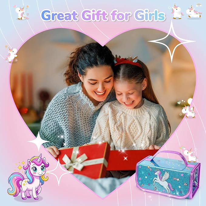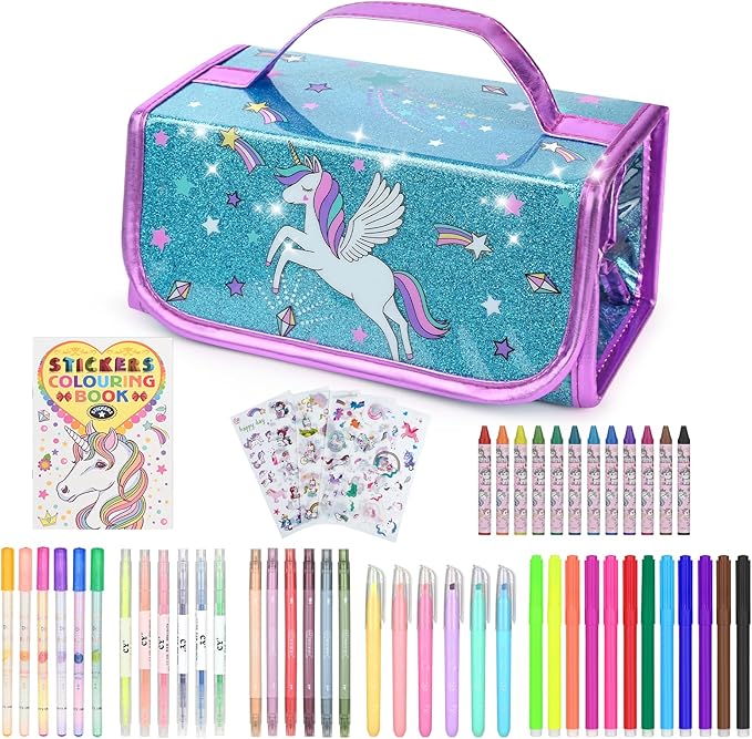 - 【Perfect Gifts &School Supplies】Make every happy occasion with our unicorn-themed art supplies. Whether you're searching for kids back to school supplies, girls Birthday gifts, Christmas presents, or simply an “I love you”surprise gifts, this unicorn marker coloring set will undoubtedly create that "WOW" moment for any little girls. They can color and design dream anyway they likes. Delight your kids with our sparkly Unicorn Glitter Pencil Case