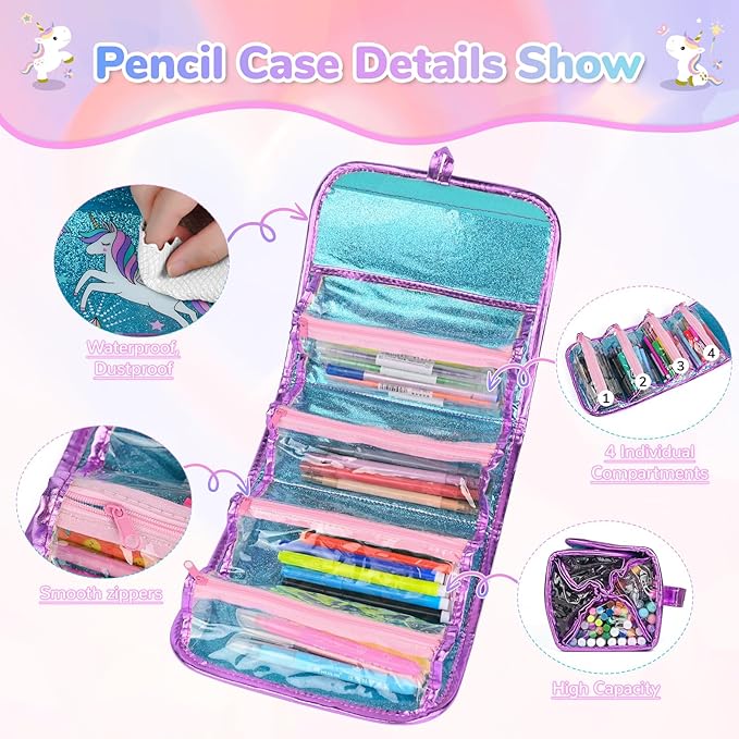 - 【Adorable & Portable Glittery Pencil Case】The high-capacity unicorn pencil case contains 4 zippered transparent compartments, making it easy for your little girl to easily access and organize her colored pens tidily at home, school, travel or other activities. When kids finish coloring, they can quickly close it with magic tape and carry it away with a handle. This case can also be used as a makeup bag or storage for other unicorn toys