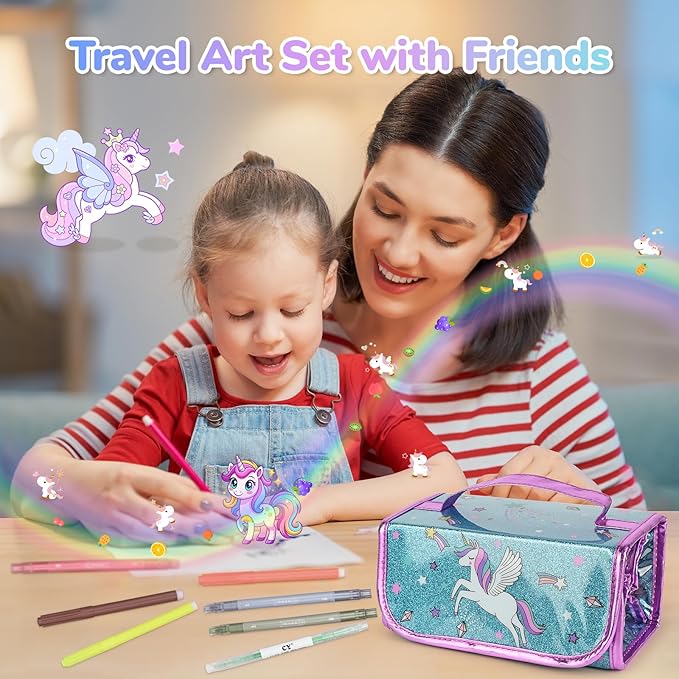 - 【Stimulate imagination and creativity】With various colorful washable markers, crayons, glitter pens, cute stickers and coloring book, this art set provides endless possibilities for creativity, stimulates kids imagination to explore their colorful artistic worlds.The wide range of accessories also encourages collaborative creations with friends, lead to social interaction and foster friendship, or enjoy warm family time through parent-child artwork. Perfect coloring supplies and school supplies for girls age 4-9 years old