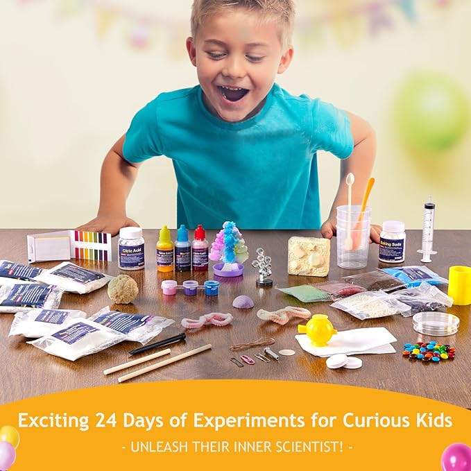 - 24 SURPRISES WAITING TO BE DISCOVERED: Behind each window lies an amazing experiment, ready for children to explore. Imagine uncovering underwater lava, journeying through the interstellar universe, growing a crystal tree, bouncing ball, rainbow Ferris wheel, or marveling at a geodes. And on the child's birthday, an extra special surprise awaits: dig up the stone bricks to reveal a stunning desert rose. Each day brings a new adventure, sparking curiosity and wonder!