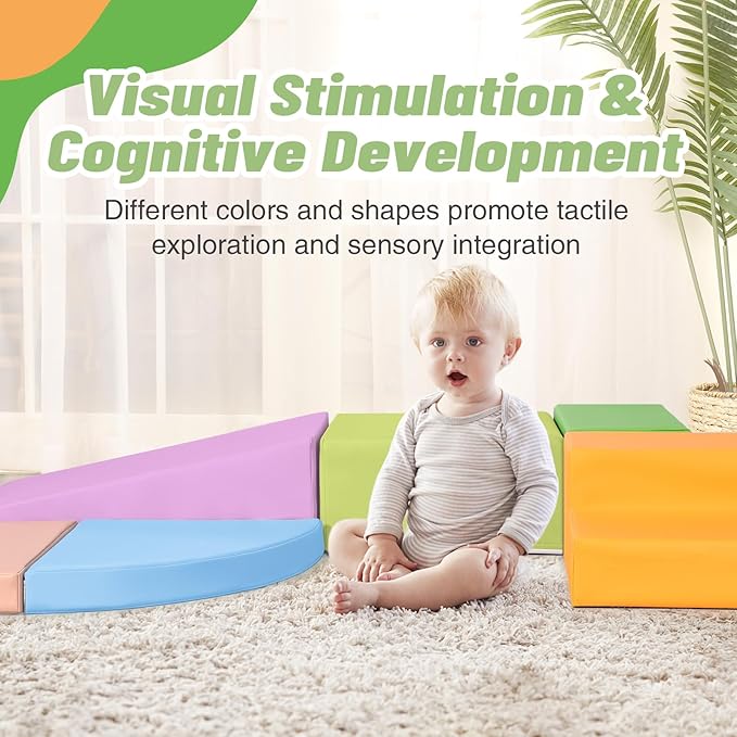 - 6-Piece Set: Baby climbing blocks consists of 1 apricot pink half-moon, 1 blue half-moon,1 orange stair, 1 green stair, 1 grass green square and 1 purple slide. This soft play equipment stimulates your child's imagination to create endless combinations of structures, allowing them to enjoy the fun of the toy as they climb up and down, stacking and swapping four different shapes