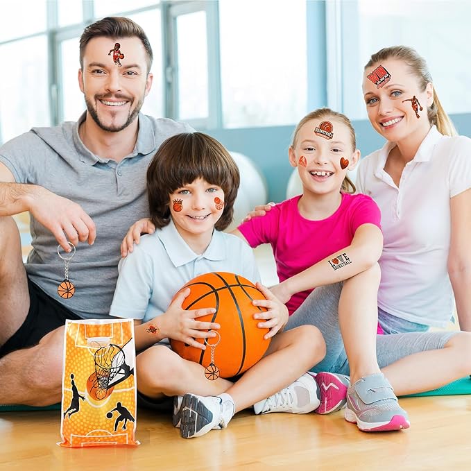 - Basketball party favors set: there are a total of 295 pieces of basketball party supplies, including 24 sheets of basketball temporary tattoos, 24 mini basketballs, 24 basketball slap bracelets, 24 basketball keychains, 25 basketball gift bags, 24 basketball bracelet and 150 basketball stickers, different items with adequate quantity to satisfy your diverse and basketball party using, decorating and sharing needs