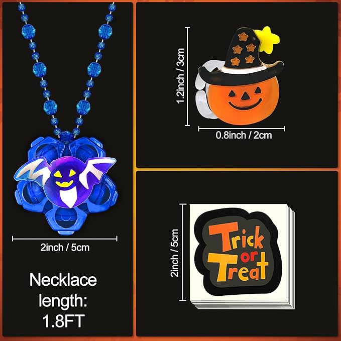 - [ Halloween elements ] Like Pumpkin, Spider, Bat, Ghost, Skull with the bright vibrant colors. The Necklaces Bracelets can be rotating, and led ring can flash for blue or red light, and temporary tattoos will glow in the dark. These light up flash Halloween toys will very popular party favors or kids hot bulk toys or so attractive to kids for Halloween treat bags or Halloween party supplies