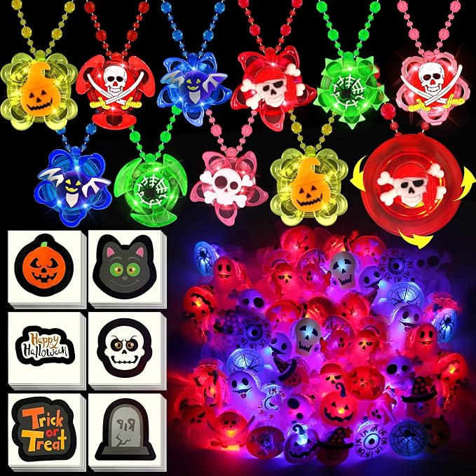 - [ Halloween Light Up Toys ] These light up Halloween toys are perfect. 10 LED Light Up Spinning Necklaces, 40 flash LED rings, 48 Halloween temporary tattoos. totally in 100 pcs. The style may be a little different. Enough quantities and styles for family or friends gathering