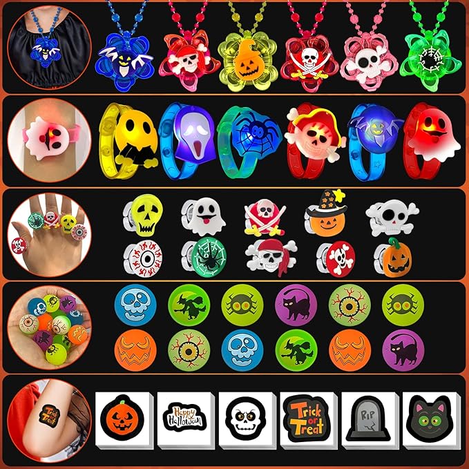 - [ Halloween Light Up Toys ] These light up Halloween toys are perfect. 6 LED Light Up Spinning Necklaces, 6 LED bracelets, 36 flash LED rings, 12 bouncy balls can glow at night, 40 Halloween temporary tattoos. totally in 100 pcs. The style may be a little different. Enough quantities and styles for family or friends gathering