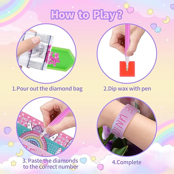 - 【DIY Diamond Art Bracelet Making Kit】- Includes 3 diamond art bracelets, easy to play, stick the diamonds on the bracelet according to the numbers or letters, girls can use their imagination and creativity to DIY their own bracelets, improve children's hands-on ability. The diamond bracelets are adjustable in size and comfortable to wear, perfect for girls' small hands