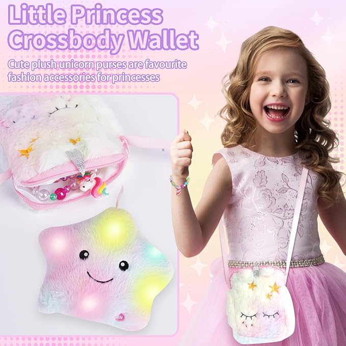 - 【14PCS Unicorn Gift Box for Kids】- Adorable unicorn toy gift set for girls fulfills all the fantasies of a little girl, unicorn gift box includes glow in the dark blanket, light up star pillow, 3 diamond art bracelet, 5 hair ties, eye mask, crossbody bag, jewelry kits. Plenty of unique accessories to bring endless fun and surprise to your baby