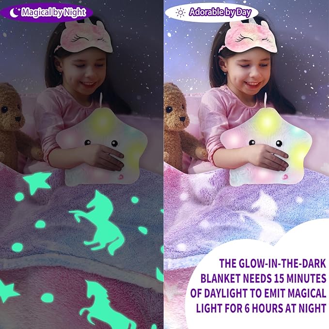 - 【Unicorn Glowing Blanket & Light Up Star Pillow】- 60 L x 50 W unicorn glowing blanket is made of high quality plush polyester fiber for softness and comfort, and the glow-in-the-dark design provides a unique sleeping experience for girls. Plush star pillow with light, press the "ON" button can emit colourful lights, just like real stars