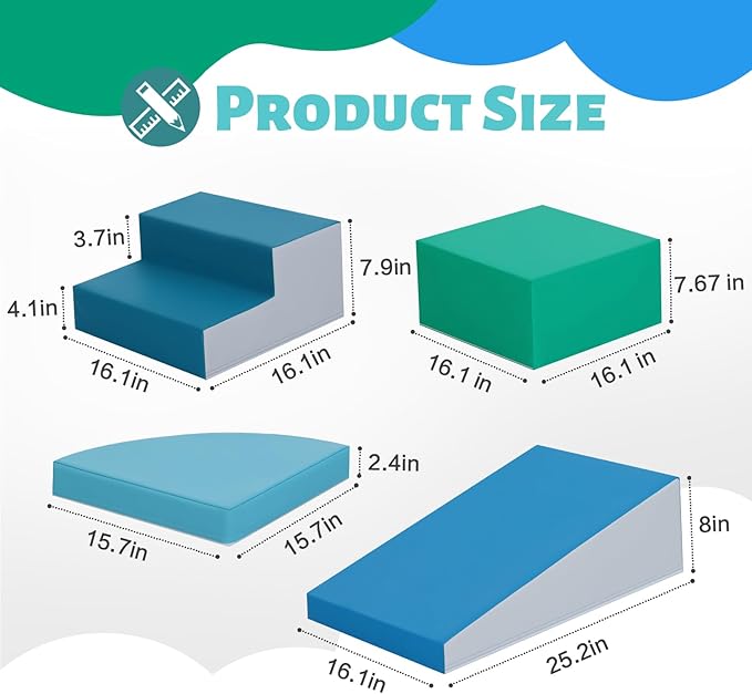 - 6-Piece Set: Baby climbing blocks consists of 2 dark green stairs, 2 sky blue half-moon, 1 green square and 1 navy slide. This soft play equipment stimulates your child's imagination to create endless combinations of structures, allowing them to enjoy the fun of the toy as they climb up and down, stacking and swapping four different shapes