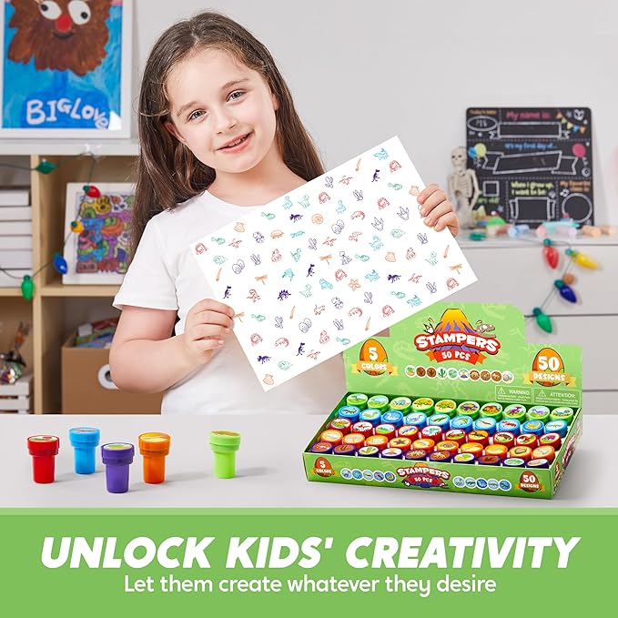 - Variety Pack: This set includes 50 colorful stampers featuring a wide range of fun and vibrant designs like sea dinosaurs, prehistoric insects, fossils, flying dinosaurs and etc.