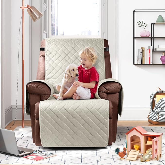 KinCam 100% Waterproof Recliner Chair Cover, Reclining Couch Covers for Pets, Dogs, Recliner Couch Slipcover Furniture Protector with Elastic Straps for Kids(23.6", Ivory)