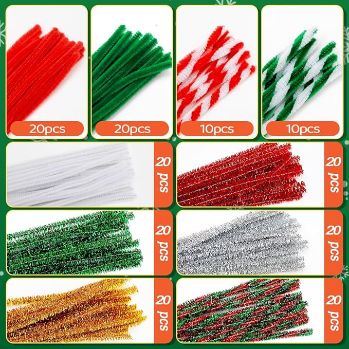180pcs Christmas Pipe Cleaners, Pipe Cleaners for Crafts, Craft Supplies Multicolor Chenille Stems for Art&Craft Christmas DIY Projects(10colors,Christmas)