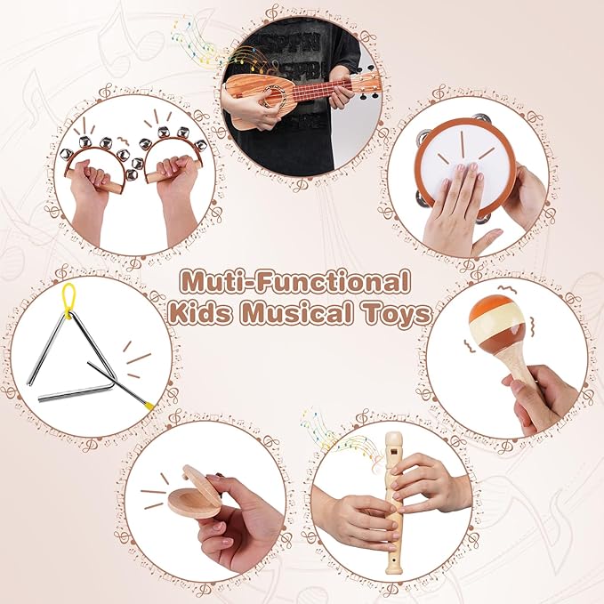 - High-quality Material: The musical instruments set is made of high-quality materials with smooth edges. The ukulele uses four sturdy nylon strings, The ukulele uses four sturdy nylon strings, which create a stable and crisp sound. It's not easy to break and user-friendly to toddlers' fingers, which is perfect for beginners.