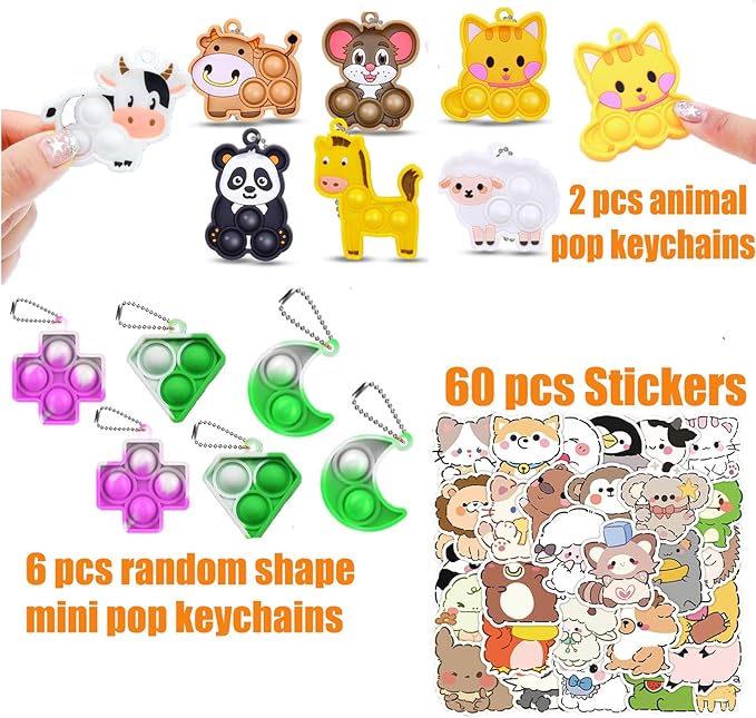 - 【124Pcs Party Favors Set】 The 124 pieces kids' party favor sets contains a rich variety of small toys that allow children to interact and play at parties, including: 2 animal pop keychains, 3 cute pop keychains, 3 pop bracelets, 6 mini pop keychains, 4 mini animal keychain, 60 Stickers, 10 slap bracelets, 6 mochi squishies, 6 sticky hands, 6 animal Pull Back Cars, 6 Tumbler, 6 Pull Back Planes, 6 mini skateboard.