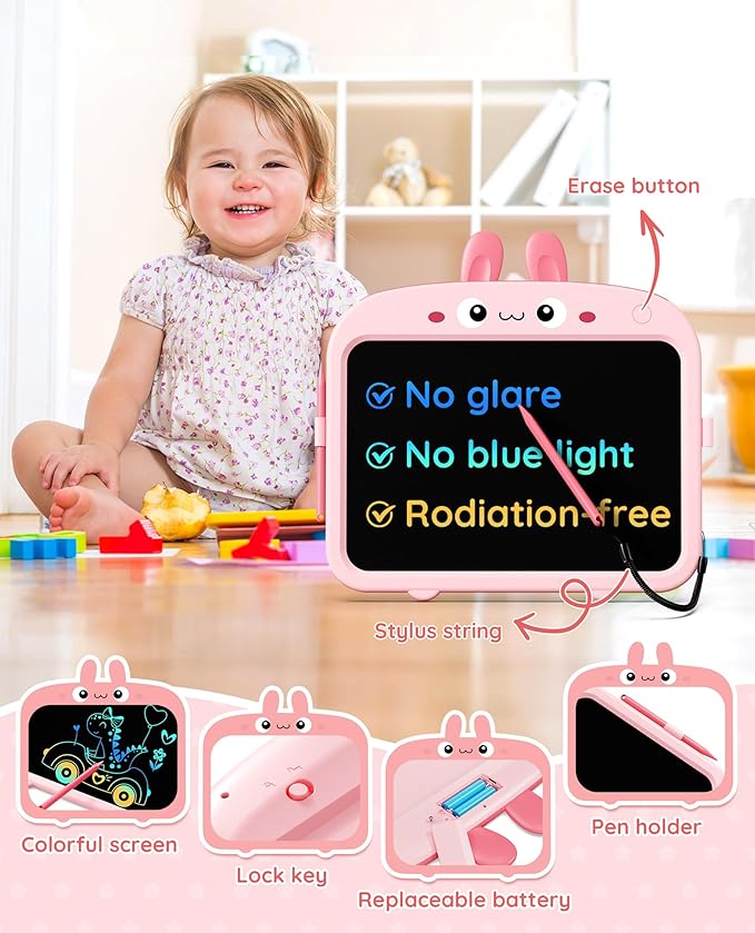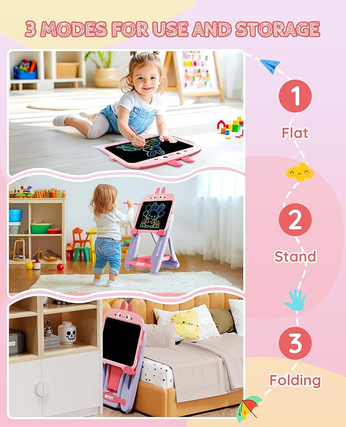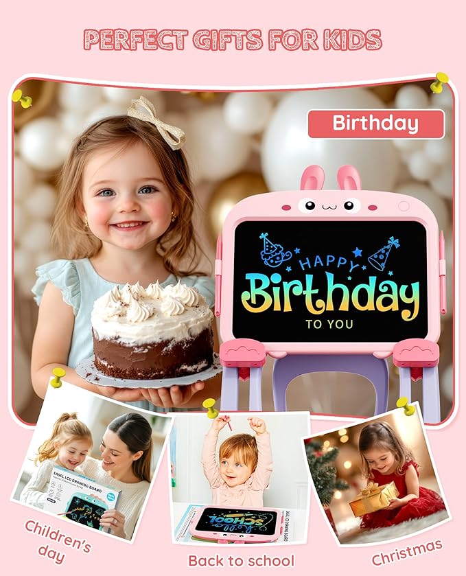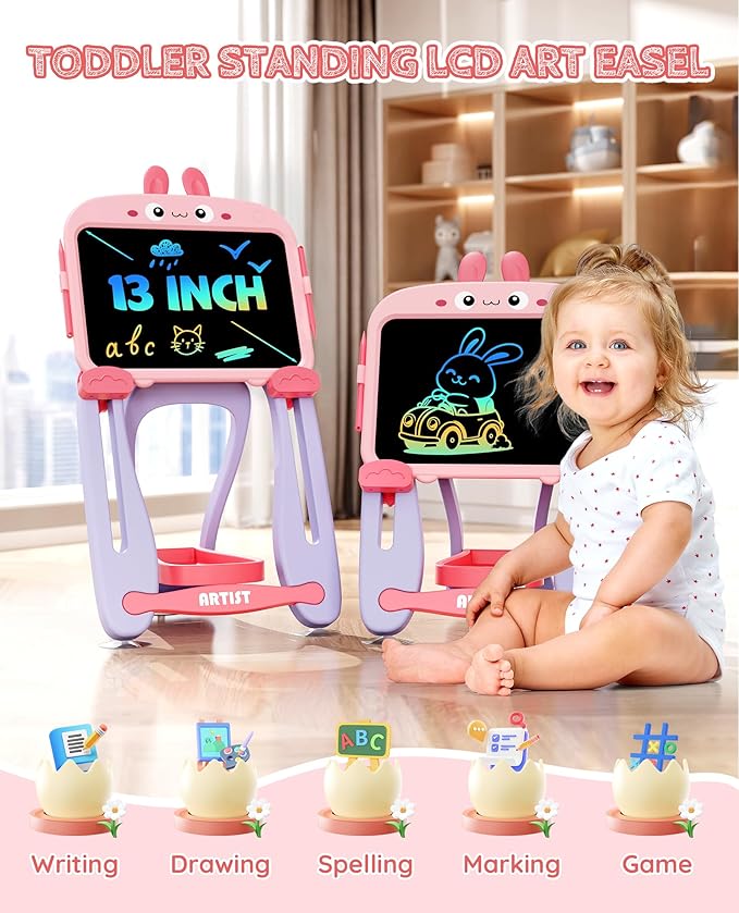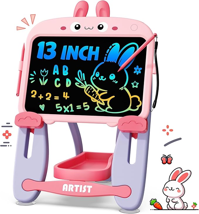TEKFUN LCD Writing Tablet Doodle Board, 13 Inch Pink Adjustable Standing Art Easel for Toddler, Rabbit Erasable Drawing Board for Kids, Educational Toys Birthday Gift for 1-6 Year Old Girls