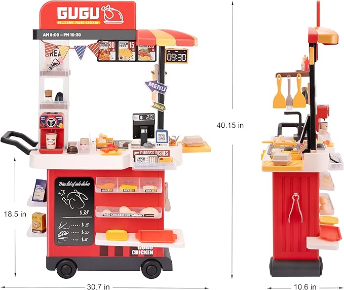 - Game kitchen set: This children's game kitchen set includes a variety of kitchen toys, food that changes color after cooking, simulated takeaway food packaging scenes, functional sinks with running water, ordering food and different payment games science that simulates life with cash, cell phone payment, bank card payment and many other payment methods and other accessories. Sticking matching stickers will make the whole suit more real.