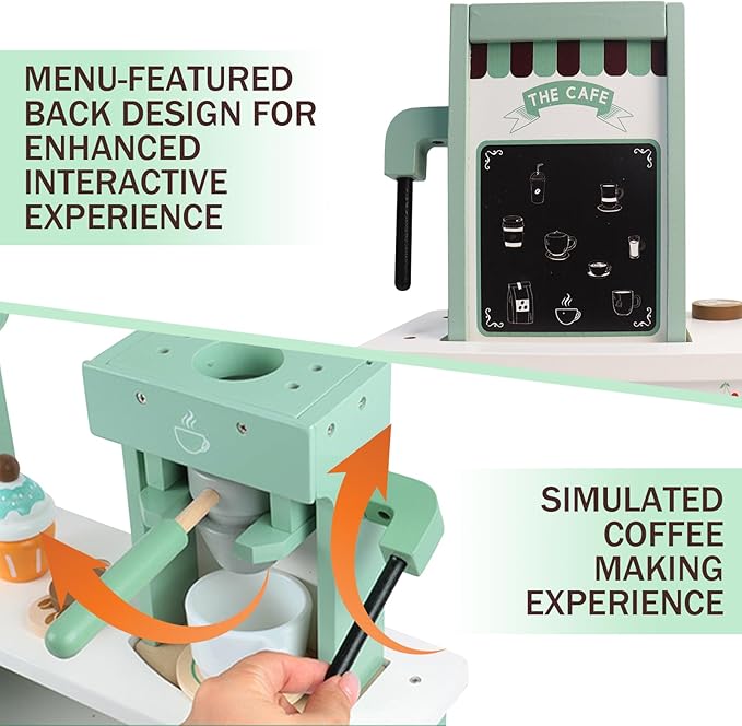 - Simulation Wooden Coffee Playset: Brew coffee like a real barista, place coffee beans into the bean hopper, rotate the crank to grind the coffee beans, grip the handle to extract coffee essence, pour the coffee out, add latte art, and then enjoy it with a toy dessert