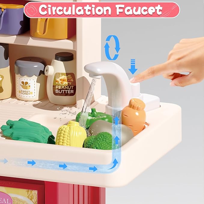 - Stove with Sound, Light, Smoke and Play Sink : The stove emits light and realistic cooking sounds and smoke to provide a realistic cooking experience. The circulating sink can be pressed to produce running water, which kids can use to wash fruits and vegetables, and dishes. The handwritten menu board can help kids record their daily recipes