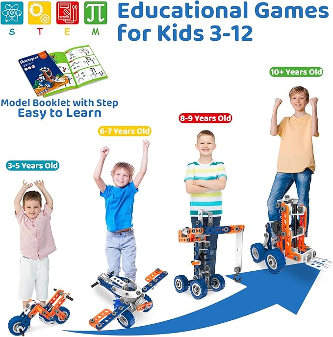 - The corresponding parts and installation steps are explained in detail in the instructions. The building toy kit exercise child's self-confidence, hands-on ability and problem-solving ability. Stem building kits for kids ages 4-8. Kids will be proud of their own projects that actually moves. Stem kits toy for boys ages 5 6 7 8 year old and up. The Stem building toys isn't metal.