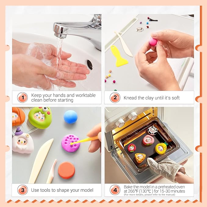 • Baking Methods: There are three ways to harden the clay: (1) Baking in an oven at 130°C (266°F) for 10-15 minutes (recommended). (2) Using hair blower heating for small works size in 1-2 inches. (3) Boiling for smaller works size in 1/3 inch. Do not use a microwave. The clay is easy to clean after use, not sticking to surfaces. Simply rinse with water to remove residue, saving you time and effort during the creative process