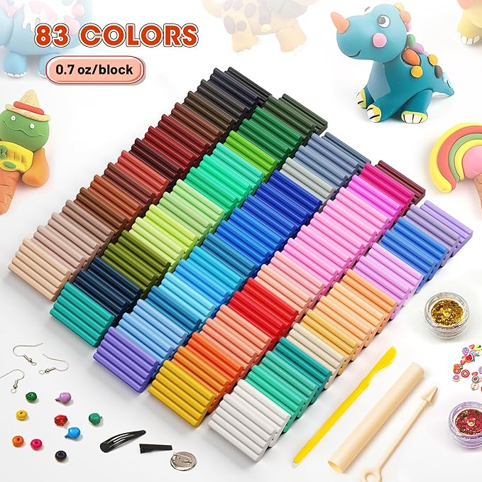 • 83 Colors Polymer Clay Kit: 83 colors of oven-bake clay in 0.7 oz/blocks provide ample quantity for various projects. Alongside, it comes with 19 sculpting clay tools and 17 different accessories like bells, beads, earring hooks, hair clips, ring holders, keychain pins, phone charms, etc. Easy to use, catering to various crafting needs. Perfect for kids, adult, beginners, artists to create jewelry, handicrafts, and sculptures