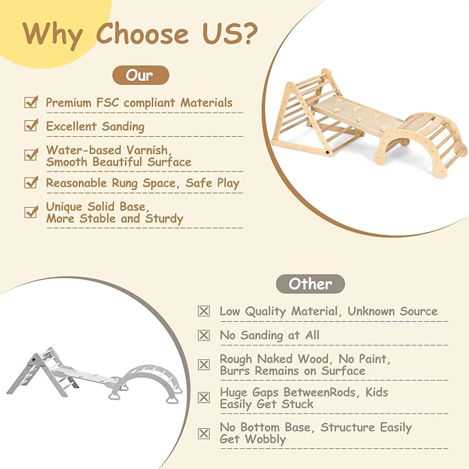 - 【FSC-certified Safe Materials, CPSC Approved Structure】Dripex pikler triangle climbing set is crafted from 100% traceable, natural, non-toxic wood and sanded to a smooth, edge-free finish after hundreds of polish. With our toddler climbing toys indoor, you can rest easy knowing your child is playing with a high-quality materials jungle gym, free from concerns about unknown sources or poor-quality wood. Furthermore, it has been approved by the US CPSC, which is a power proof of products' safety