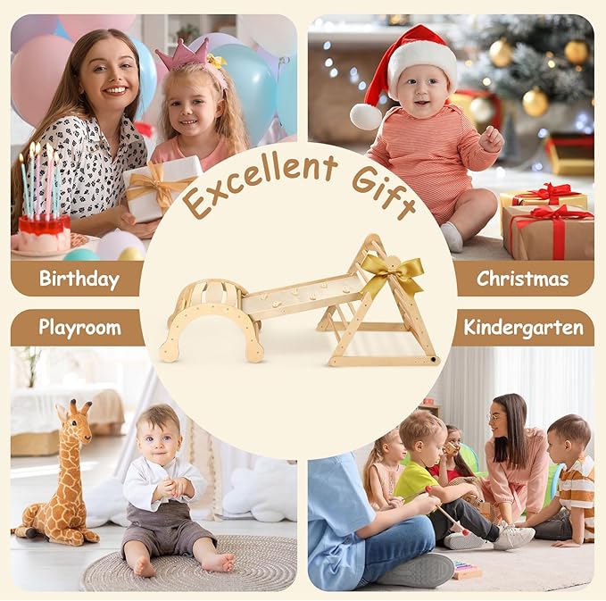 - 【Wonderful Gifts for Growing Kids】Dripex pikler triangle set with a unique structure makes for the perfect birthday present! Embracing the Montessori educational philosophy, it serves as both an enjoyable playset and a valuable learning tool that supports children's early development. It encourages physical activity and mental engagement, fostering well-rounded growth, making it an ideal pick for any kids' occasion!