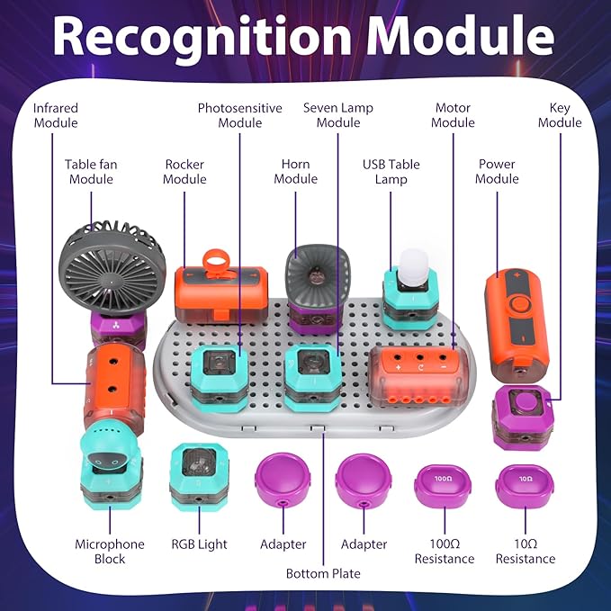 - 201 PCS STEM Circuit Kit: A fun way to introduce kids to the world of electronics. This science kit features a wide array of electronic modules (e.g.power module, RGB light module, horn module, microphone module), resistors, wires and connectors, and various small components to build 3D constructions. Ideal for ages: 8 years and up.