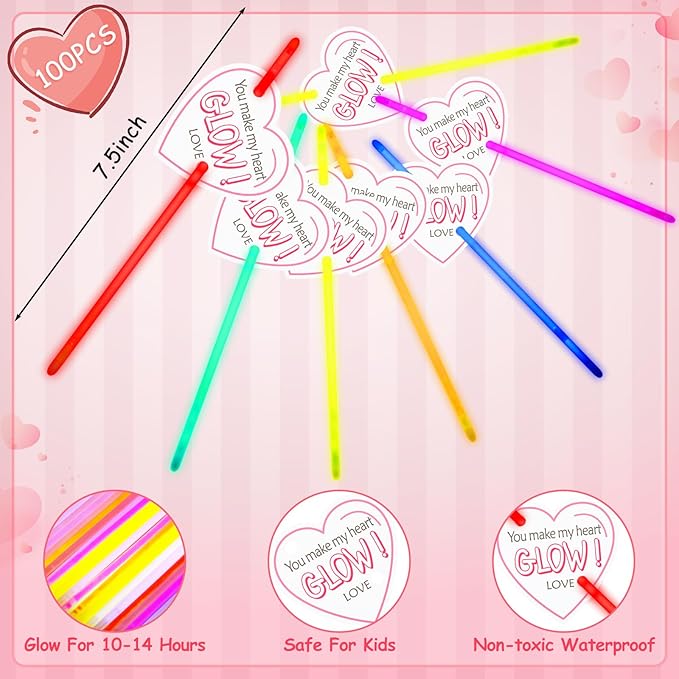 - Quantity and Size: you will receive 100 colored glow sticks with connectors, as well as 100 heart cards, with each card measuring approximately 2.3 x 2.3 inches/ 6 x 6 cm, and glow sticks measuring approximately 7.9 x 0.2 inches; The quantity is sufficient to meet your needs