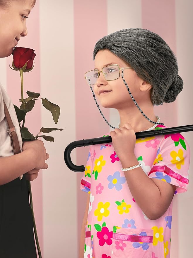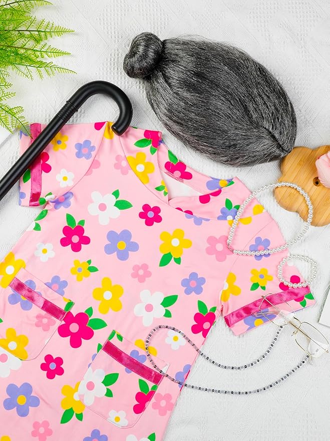 - Everything You Need: Huskein comprehensive costume set includes a grandma dress, black white bun wig, granny glasses with a chain, pearl necklace, pearl bracelet, wig cap, and kids cane. Perfect for creating the perfect old lady costume for kids.