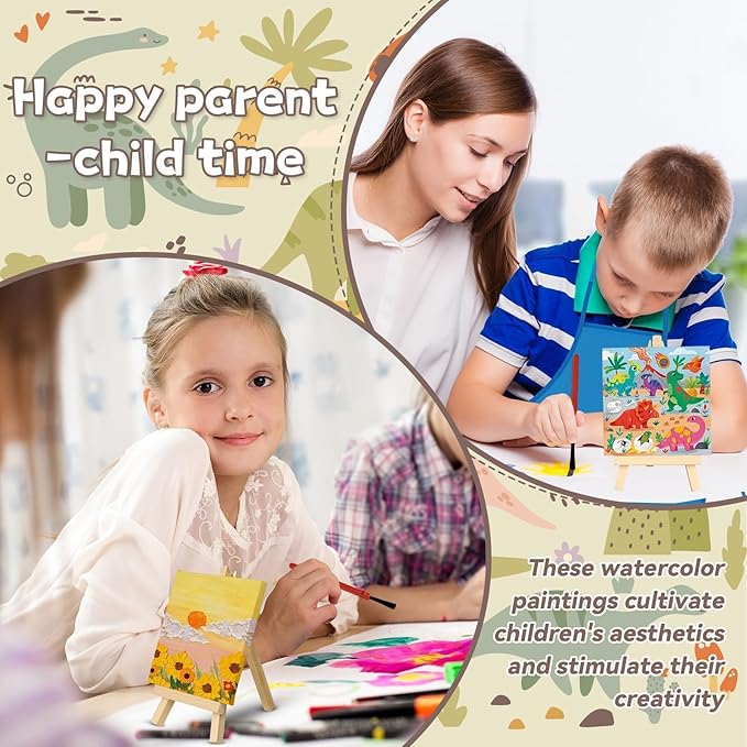 - All-Inclusive Paint Party Supplies: you will get 24 dinosaur cards, 24 small canvases, 24 sturdy small easels, 24 watercolor paint sets, 24 multi-colored aprons tailored for children, and 24 gift bags. You can put them in the bags and give them to beginner artists.