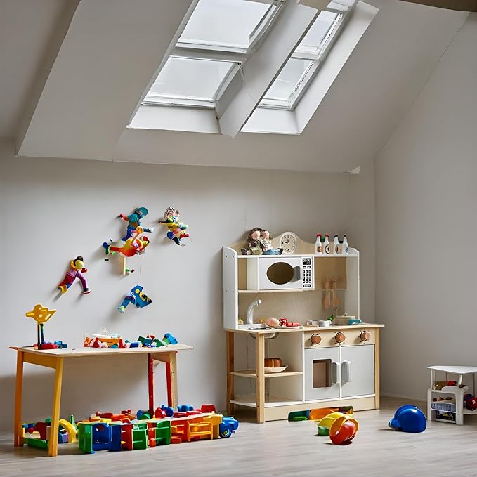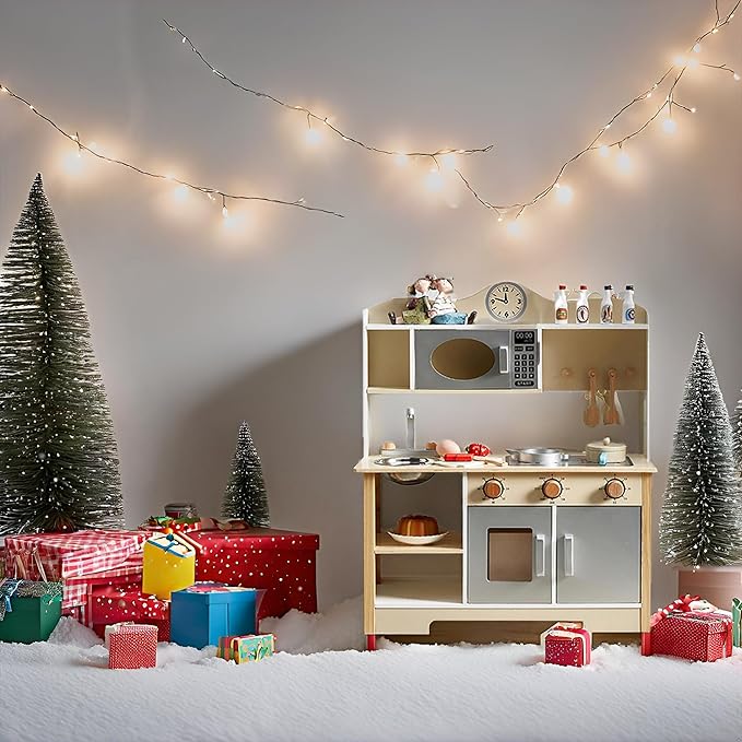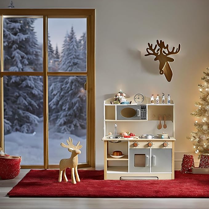 - Realistic Design: This wooden play kitchen looks just like the real thing, with its cute and space-friendly design, kids will feel like professional chefs, while developing their creativity and imagination.
