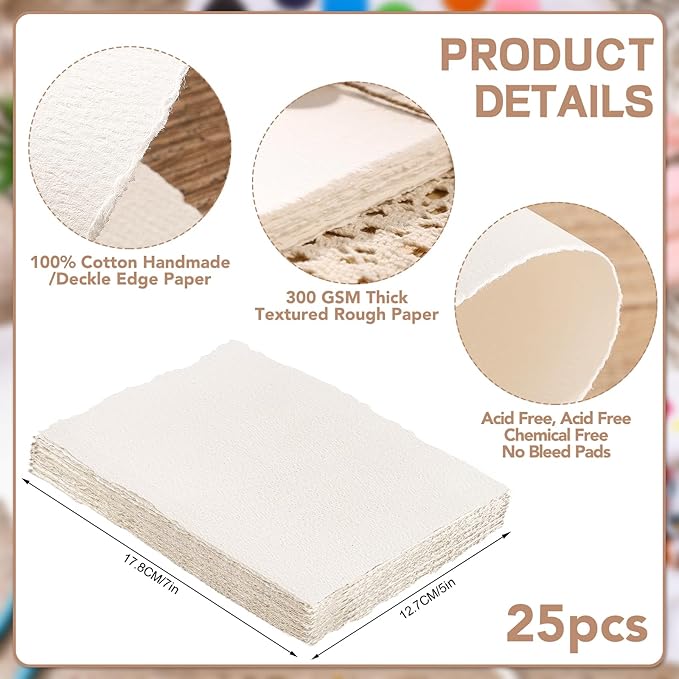 25 Sheets Watercolor Paper, 300 GSM Deckled Edge Paper 5 x 7 inch Rough/Textured Handmade Paper Cotton Paper White Textured Paper for Watercolors, Wedding Invitations, Cards, Crafts