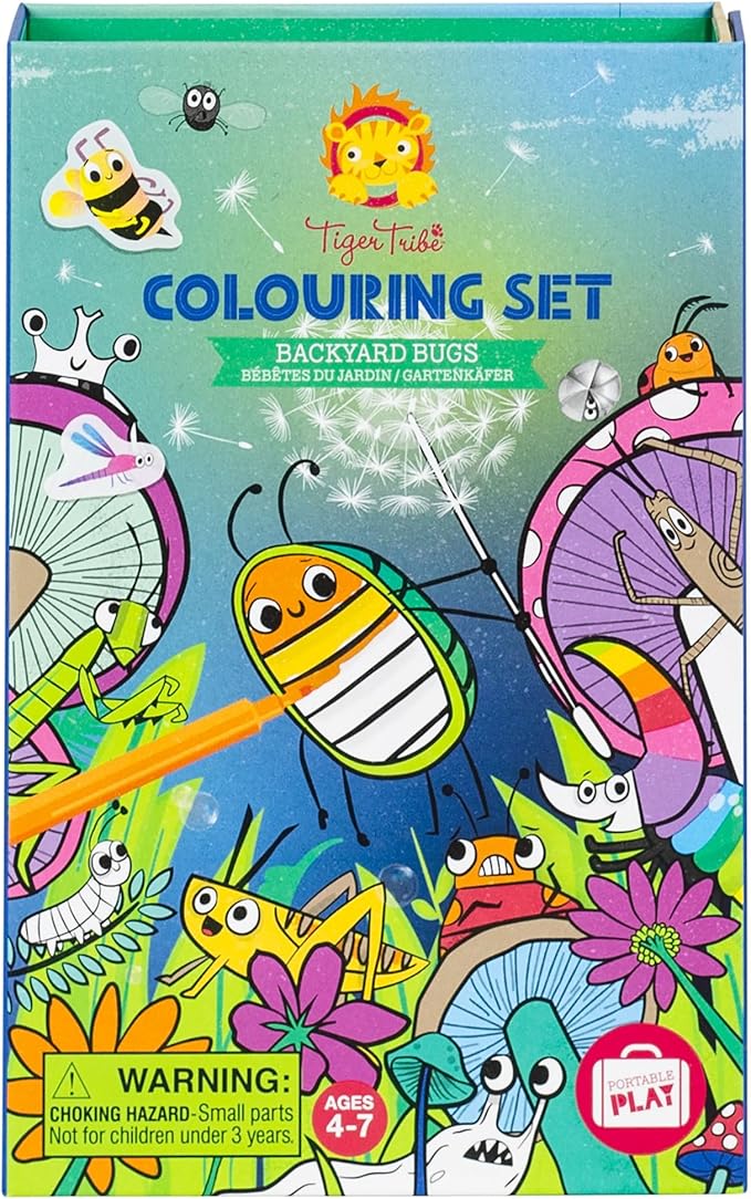 Tiger Tribe: Coloring Set - Backyard Bugs - All-in-1, Stickers & Markers, Cute Garden Critters, Magnetic Sealed Storage Box for Travel, Kids Ages 5+